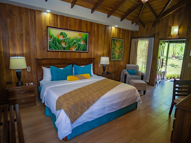 Die 47 Standard-Zimmer befinden sich in den auf dem weiten Gelände großzügig verteilten Bugalows. Alle Bungalows sind aus Holz gebaut, geräumig und verfügen über ein Badezimmer mit Dusche/WC, einen Ventilator, Klimaanlage, Terrasse, Kühlschrank und Kaffeemaschine. Die Zimmer haben Blick auf den Garten und den Vulkan Arenal.